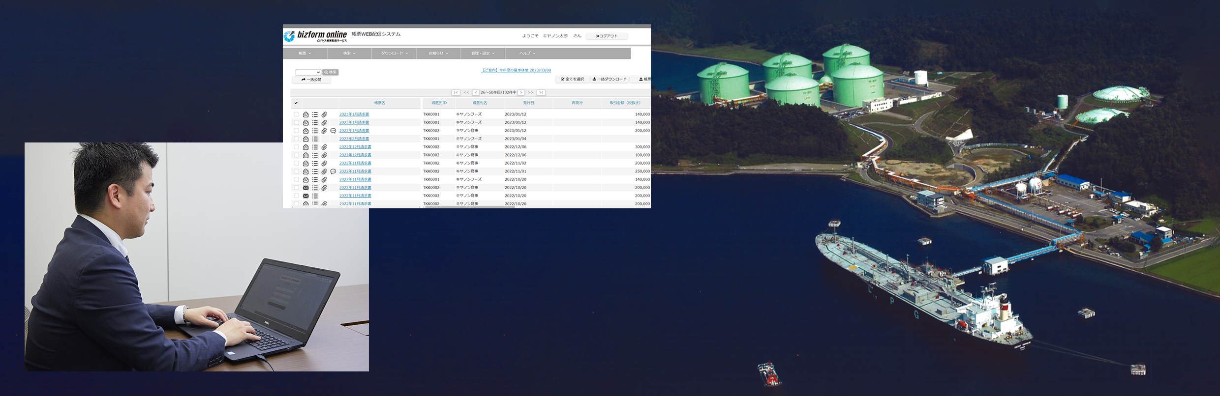 導入にあたっては、キヤノンMJを含めた3社からのアプローチがあり比較検討が行われました。bizform online導入の決め手となったポイントはどこにあったのでしょうか。「一番の決め手は、こちらの希望する帳票配信フローを実現できた点です。当社では、本社一括配信ではなく各支店にて配信される運用体制を希望していました。元売り企業ということもあり請求書の機密性は高く、支店完結が望ましかったのです。そのフローをシステム上実現できたのはbizformonlineだけでした。先行して他社の提案を受ける中で、本社から一括して配信するしかないと半ばあきらめていたところへの提案だったこともあり、大変嬉しい出会いとなりました。また、基幹システムとの連携も大変シンプルでほとんど手間を感じることなく対応できたのは驚きでしたね。多少の手間やコストは覚悟しなければいけないかと思っていたので、その点もこのサービスを選んでよかったと思っています」。