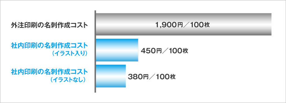 外注していたときは名刺1枚あたり19円かかっていた印刷コストが、カラーイラスト入りでも4.5円/枚と7割以上も削減できる見込みだ。また、100枚単位でしかできなかった業者への名刺発注が、1枚からでも自由に作成できるようになった点も職員に大いに喜ばれている。