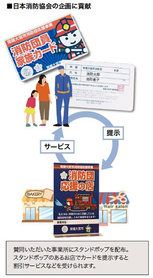 これは、賛同いただいた事業所の協力により、日頃仕事をしながらボランティアで活躍してくれている消防団員とその家族の皆さんを応援するというものであり、具体的には買い物や食事などの際にカードを提示すると割引など相応のサービスが受けられるというもの。