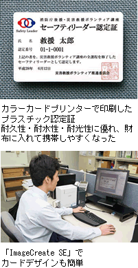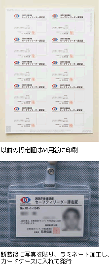 同講座では、災害知識、防災対策、応急手当などを、座学、技能講習、模擬体験で身につけてもらい、3日間の講座が終わると、受講者には「セーフティリーダー認定証」が発行される。以前は、専用のA4用紙に印刷してカードサイズに断裁し、写真を貼ってラミネート加工していたが、作成にかかるコスト・手間・時間が大きな負担になっていた。