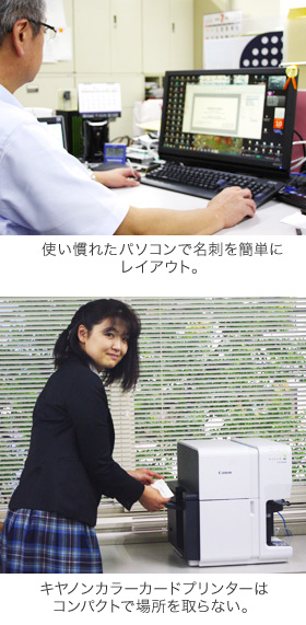 導入後は付属の名刺作成ソフトImageCreateSEを使って、総務部内で名刺をデザインしている。社員は従来通り名刺の発注を総務部へ依頼するが、違うところはその日のうちに名刺を作成して手渡すことができること。それまでは発注から出来上がりまで1週間かかっていたのだからそのスピードに驚かれるのも無理はないだろう。「もうできたの?!」という声とともに、その仕上がりのきれいさにも満足してもらっている。