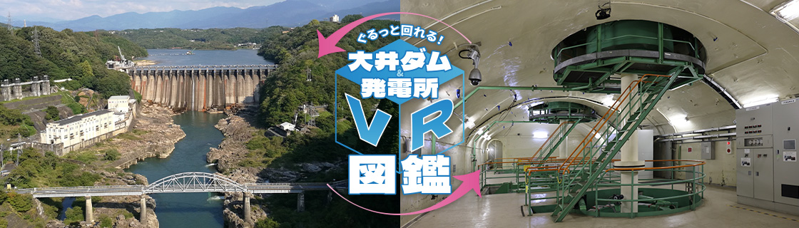 パソコンやスマートフォンで操作し、大井ダム・発電所の敷地内をまるで散策しているように360度ぐるっと見て回れます。発電所建屋や配電盤室、水車室といった普段は出入りできないレアな場所も自由自在に見学でき、VR空間の各所に配置されたタグをクリックすると水力発電の仕組みや歴史紹介などのメッセージが表示されて分かりやすく学べます。
