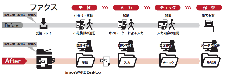 導入後は東西2拠点で複合機が14台に集約され、受信した注文書はPDFに変換してファイルサーバーに送信されるようになった。担当者は自席のPC上でファイルを仕分けし、基幹システムへの入力、チェック、保存するフローとなった。導入直後は一部の担当者は紙に出力できないことに抵抗感を持っていたが、今では「もう紙には戻れない」という声が大きいという。BS東日本業務部の神農は「机の上から紙がなくなってすっきりしました。お客さまから問い合わせを受けて注文書を探す際も、受信フォルダーの中を覗いて受信日時やファイル名などから検索ができるので、短時間で答えられるようになり、お客さま満足度も向上しました。」と効果を実感している。
