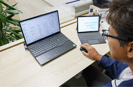 その後、約2週間のトライアルを実施していただき、PCやスマートフォン、タブレット端末で、いつでもどこでも案件ごとの施工状況を確認できるKANNAの実用性の高さをリアルに実感。画面のUI(ユーザインターフェース)デザインが直感でわかりやすく、見た瞬間に「これならベテランの職人さんも使えるな」とイメージできました。実際に触ってみると資料のアップロードや送付は、ドラッグ&ドロップの簡単操作で可能。社外とのやりとりの精度やスピードが格段にアップし、業務効率化を実現できると十分に納得できたので、トライアルの1週目を終えた時点で、ほぼ導入を決断していました。
