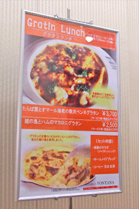 「ポスターは、人が通るところに目立つようにたくさん貼りますので、同じ物を5、6枚出力します。例えばエステメニューのポスターは、ロビー、エステサロン内、エステ受付などに貼ります。基本的には、ポスター掲示は館内のみですが、A4のエクセルデータを拡大出力した、シャトルバスの時刻表をお帰りのお客さまのためにホテル玄関に掲示しています。ポスターをさりげなく掲示する事で、オーダーに繋がっているケースもありますので、効果は出ていると思います。立て看板用出力の後処理についてですが、大き目に出力してボードの裏面に巻き込み、テープで貼っています。あとは、額装するだけの物もあります。大きい座席表は、パネルに貼る事もあります。掲示場所や掲示期間に合わせて、装丁も変えています。」(小泉氏、池田氏)