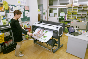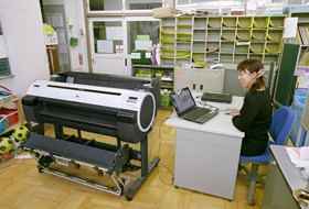 imagePROGRAFを導入する以前、同校では、モノクロの感熱式拡大機を使ったり、A3コピーを貼り合わせたりして拡大教材を作っていた。しかし、今は教科書や参考書もほとんどがカラー。モノクロの絵では理解しづらいし、A3で分割印刷して貼り合わせるのも手間と時間がかかる作業だった。そこで、キヤノンから大判プリンターの提案があり、デモンストレーションを見た教職員の間からは、「貼り合わせないで大判カラー教材ができるなんてすごい。」「これなら子供たちの目を引く。」という声が多く聞かれ、学校の予算会議で導入が決められた。