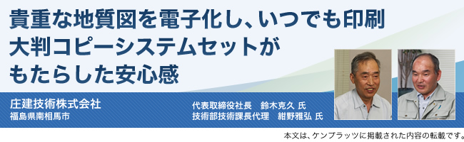 福島県南相馬市の建設コンサルタント、庄建技術(株)は以前から使用していたキヤノンの大判プリンターに加えて、2011年11月に大判スキャナーを導入し「大判コピーシステムセット」にシステム拡張した。その結果、大判の地質図などを随時電子化し、必要に応じて大判図面として印刷できるようになった。大判コピーシステムセットは業務にどんな変化をもたらしたのか、同社の幹部に直撃した。