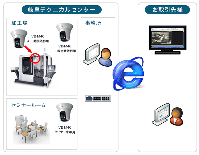- 遠隔地でも岐阜テクニカルセンターとネットワークカメラで結んで、加工体験セミナーを実施できるようになった。