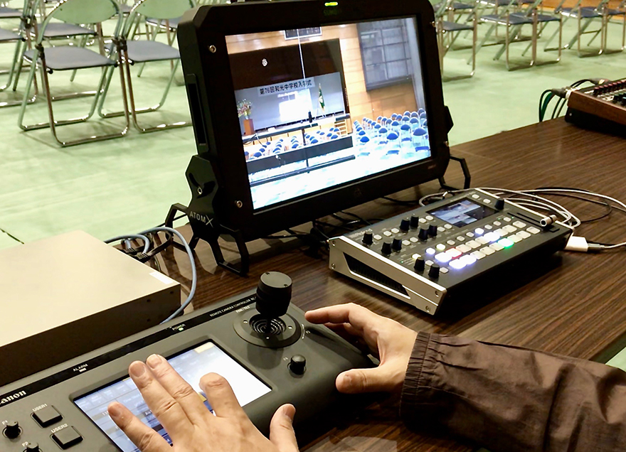 撮影機材は、体育館にリモートカメラ「CR-N500」2台、業務用ビデオカメラ「XA40」2台の構成。