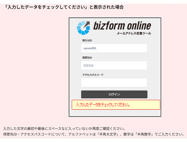 得意先ID・アクセスパスコードについて、アルファベットは「半角大文字」、数字は「半角数字」でご入力ください。