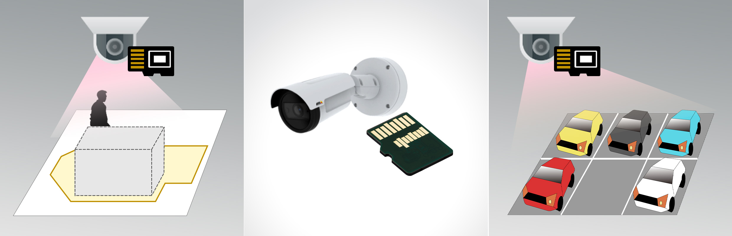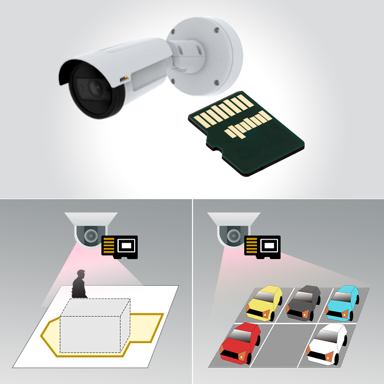 対象のアクシス製カメラ※本体のmicroカードスロットに挿入し、専用映像解析アプリケーションをインストールすることで、AIを活用した映像解析を容易に実現。