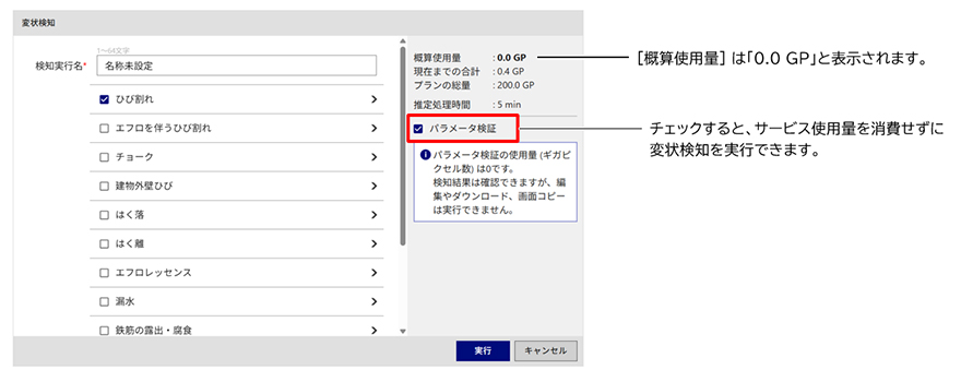 パラメータによる結果の違いをあらかじめ確認したいときなどに、サービス使用量を消費せずに変状検知を実行。