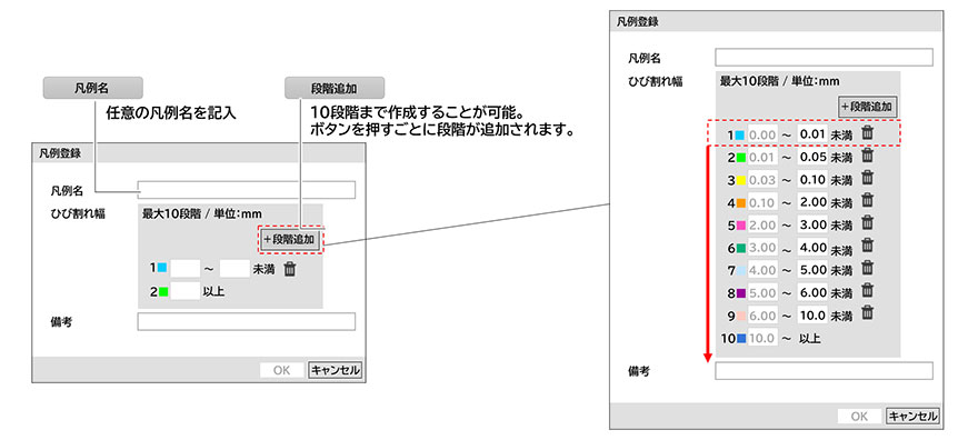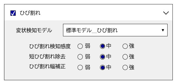 [ひび割れ] では [ひび割れ検知感度]、[短ひび割れ除去]、[ひび割れ幅補正] を設定できます。
