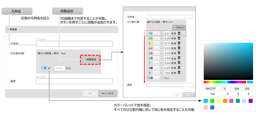 登録できるひび割れ検知の凡例20個。最小0.01mm/最大10.0mmの入力可能。10段階の設定が可能。凡例の色指定可能。