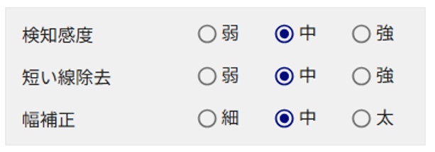 [ひび割れ]では[検知感度]、[短い線除去]、[幅補正]を設定できます。