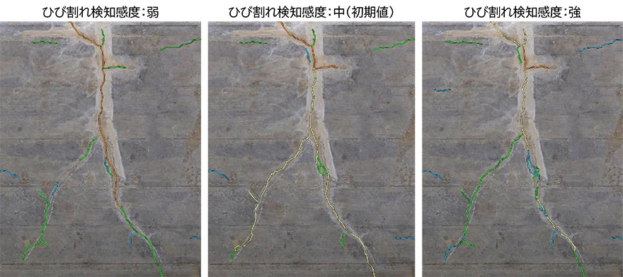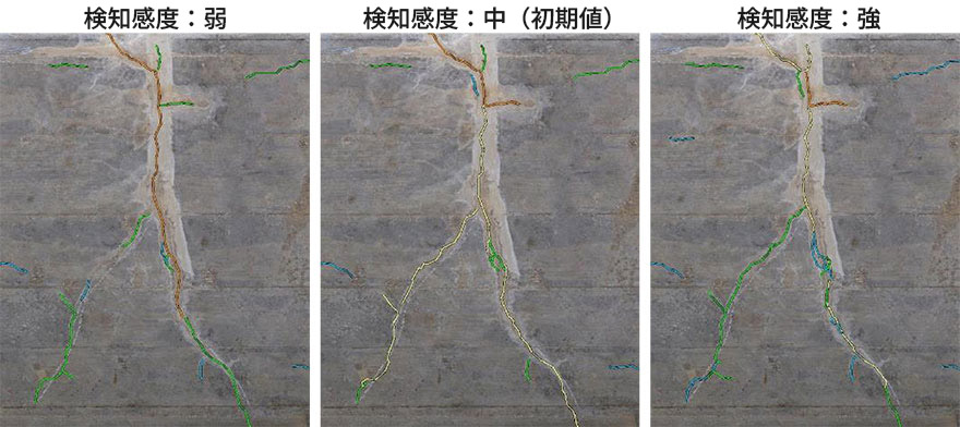 例:「ひび割れの検知感度」パラメーター調整の違いによる検知結果