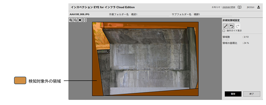 画像内に変状検知の対象外にしたい部分がある場合、非検知領域を設定。対象外と設定した箇所はサービス使用量を消費せずに変状検知を実行。