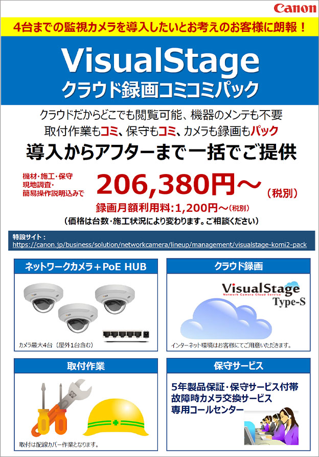 クラウドだからどこでも閲覧可能、機器のメンテも不要、取付作業もコミ、保守もコミ、カメラも録画もパックとなったパッケージです。導入からアフターまで一括でご提供します。