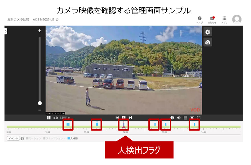 またキヤノンのクラウドカメラでも、人検知機能をご活用頂けます。人の侵入があった際メールにて通知を行うことや、ビューアーに「人検知」フラグを立て、すぐに映像を確認していただくことが出来ます。