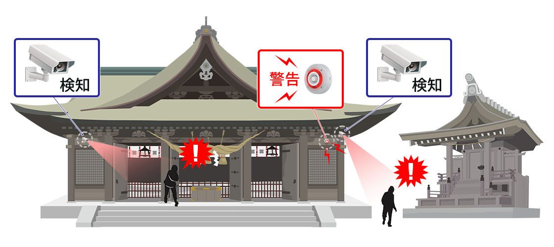 重要な文化財(仏像など)や賽銭箱の盗難対策では、通常の防犯カメラ・監視カメラの設置だけでは充分な抑止効果が期待できない可能性があります。自由にで出入りができ、周囲を樹木に囲まれ外部からの見通しが悪い境内においては、より強力な盗難対策として、カメラが捉えた映像と連動する「サイレン」を活用しましょう。