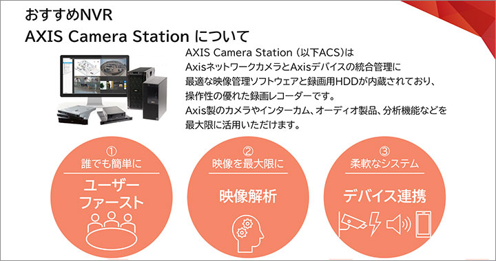 NVRについて特徴やおすすめNVRのAXIS Camera Stationの機能詳細、導入事例をご紹介しています。