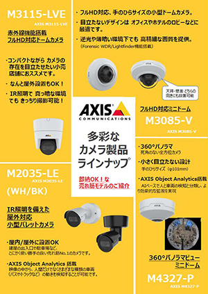ご利用シーンの多い売れ筋モデルをご紹介します。多彩なラインナップのカメラはAXIS Camera Station(録画装置)やVisualStageType-S(クラウド録画サービス)との親和性も抜群です。