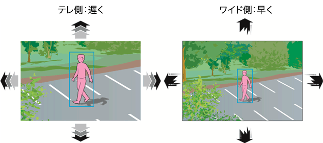 パン・チルト操作時において、ズーム位置のワイド側はパン・チルトを早く動かし広範囲を素早く確認、テレ側は狭い画角内でもゆっくり動作させる2種類の制御機能を搭載。被写体への追従性能が向上します。