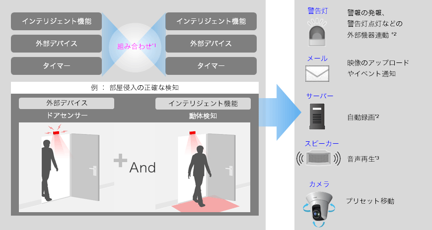 また、音量レベル検知にも対応し音による異常事態を検知可能。単体・連結※1のインテリジェント機能の検知をきっかけにさまざまな手段(メール通報、外部デバイスへの出力、映像記録など)で通知が可能。