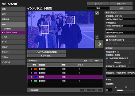 異常事態が発生した場合に、カメラのインテリジェント機能で自動的に検知し、さまざまな手段(メール通報、外部デバイスへの出力、映像記録など)で知らせることができます。従来より定評のある7種類のインテリジェント機能に加え、映像内の人物の顔を検知する「顔検知※」を新たに搭載。検知された顔の情報をVMS(Video Management Software/System)など連携するシステムで活用することで、インテリジェント機能の実用性をされに広げることができます。