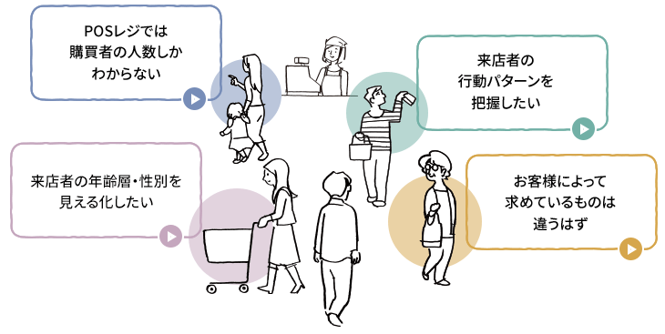 「モノが売れない時代」と言われて久しい今。お客さまが5人来て一つ売れたのか、それとも100人来て一つしか売れなかったのかでは、対処すべき課題は本来まるっきり違うはずです。しかし、POSデータ上では、売れたのはどちらも一つ。「買わなかった客」のことは見過ごされてきました。お客さまのニーズを解析するために有用なデータがそもそも存在しなかったのです。