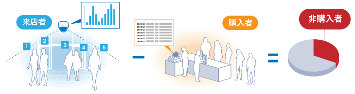 科目別・商品別・時間帯別・属性別などの売上データを詳細に分析でき、適正仕入れや売上アップのための重要な指針になっているPOSレジ。しかし、そこで得られる情報はあくまでも購買者の情報だけであり、店舗にとって実は一番必要な非購買者の人数は把握できるはずもなかったのです。そこで注目したいのが、映像の中から人数をカウントする技術です。監視カメラと言えば、これまでは万引きや内部不正の抑止に使用されてきましたが、アプリケーションを組み込むことで、指定エリア内の人数をカウントできるしくみが実現しています。購入率/非購入率の情報も新たな指針として活用することで、より正確な来店者分析が可能になるはずです。
