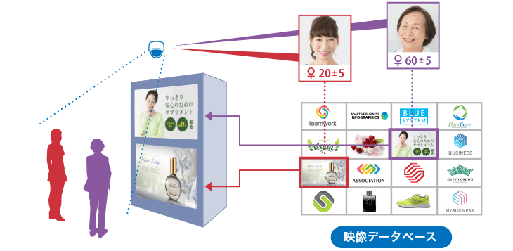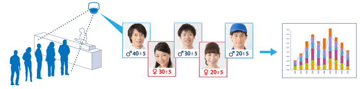 人数カウントからさらに一歩踏み込んだ解析技術として、カメラの映像情報から来店者の性別・年齢層などの属性を可視化する技術も多くの商業施設で導入が進められています。これにより、購買者はもちろん、非購買者の属性情報を把握することも可能に。人数カウントやPOSジャーナルの情報と照らし合わせることでより鮮明な来店者行動の分析ができ、時間帯によって変動する来店者数や客層の動向をつかめれば、購入率アップを狙った商品陳列やPOP制作、キャンペーン立案も実現できます。