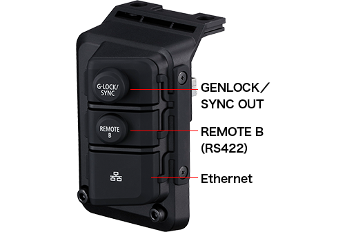 本体のREMOTE A端子(Φ2.5ステレオミニミニジャック)、または拡張ユニットEU-V1(別売)、EU-V2(別売)のリモートB端子(RS422)に接続してカメラコントロールが可能です。リモートA端子接続用のケーブル(5m)はリモートコントローラーRC-V100(別売)に付属しています。また、リモートB端子接続用の8ピンリモートケーブルはRR-10(10m)とRR-100(100m)の2種類を別売アクセサリーとして用意しています。