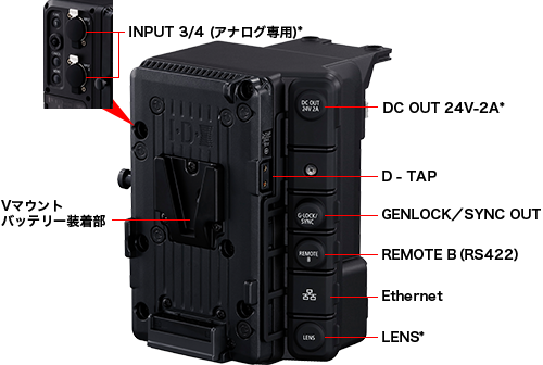 拡張ユニット2の INPUT 3/4、DC OUT 24V、LENS端子の動作には、Vマウントバッテリーからの電源供給が必要です。カメラ本体からは電源供給できません。
