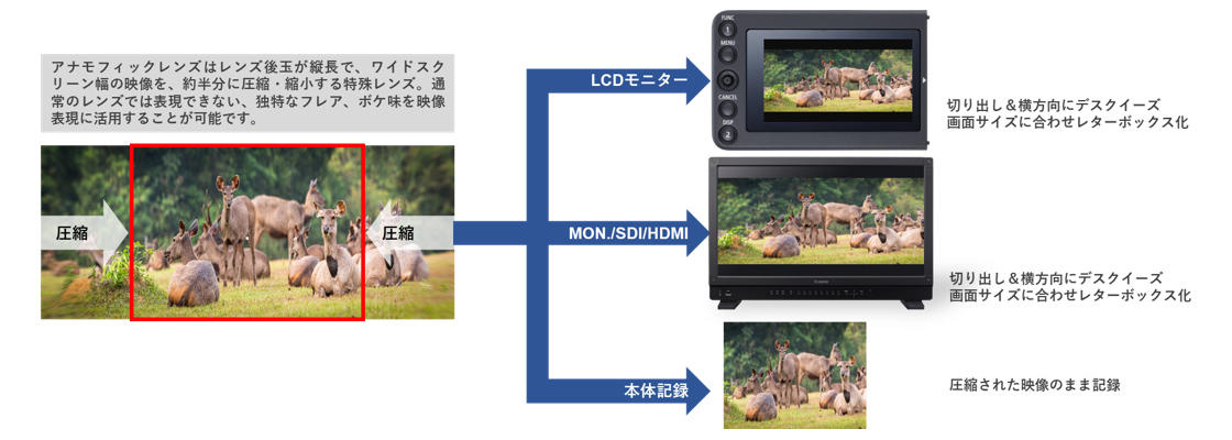 LCDモニター及びMON. / SDI / HDMI出力時はデスクイーズ後 2.39:1の画角になるよう切り出されます。拡大倍率はメニューにて、OFF / 2x / 1.8x / 1.3xを選択可能(4K 60/50P撮影時はMON. / SDI / HDMIは2Kでのデスクイーズ表示)。