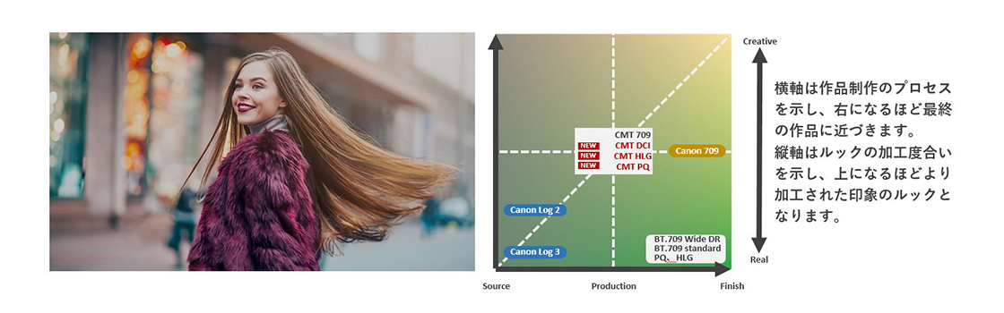 RAW撮影やLog撮影でのモニタリング映像にCMT709を用いることにより、SDRモニター上で見やすいコントラストや彩度を持ちながら、Logの広いダイナミックレンジ全体を確認することが可能です。