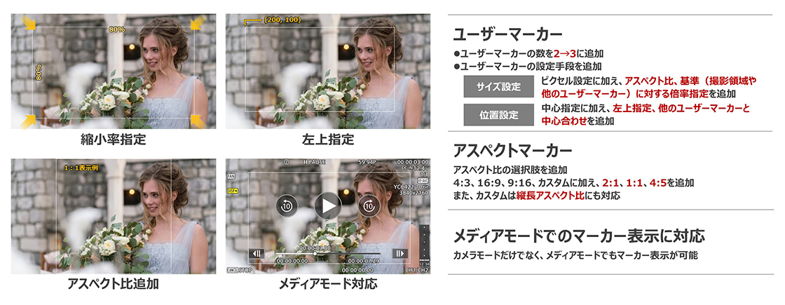撮影目的にあわせてカメラマンの意図するマーカーを表示可能。マーカーは付属のLCDモニターや外部モニターにも出力でき、表示の入/切を切り換えられます。記録される映像には影響しません。