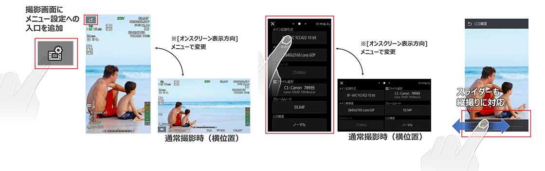 通常撮影時(横位置)と同様の感覚で、主な記録系のメニューやLCD輝度の設定をタッチ操作で変更可能。
