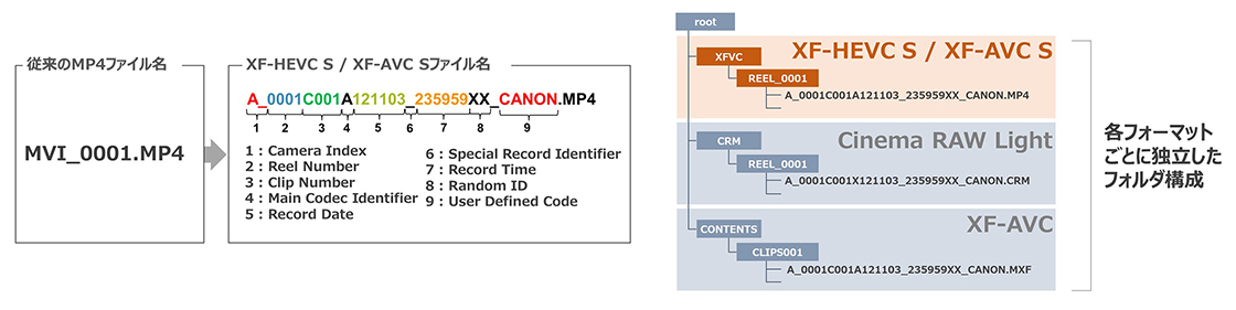従来のMP4フォーマットは、DCF準拠である数字4桁のファイル名であったのに対し、XF-HEVC S / XF-AVC Sでは新たにファイル名を変更し、カメラインデックス、リール番号、撮影日時等が表示可能になります。これにより、クリップ番号のほかにカメラ番号やリール番号を独立して管理することが可能となり、カメラを多数使用する大規模撮影現場や長編テレビシリーズのような大量に撮影クリップを運用する撮影現場にも対応が可能となります。