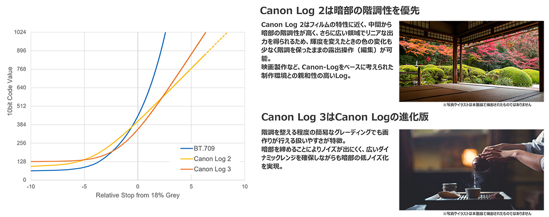 広いダイナミックレンジを確保するCanon Log 2、Canon Log 3を搭載。