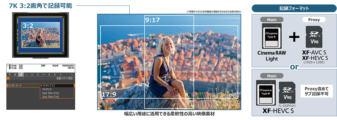 新たに搭載したセンサーモード:フルサイズ(3:2)※により、センサー全体を利用したオープンゲート記録が可能。