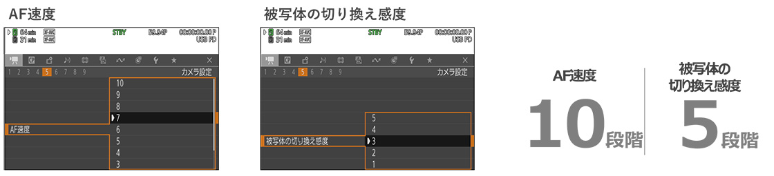 AF速度を10段階、被写体の切り換え感度(メインの被写体の切り替わりやすさとピントの乗り移りやすさ)を5段階にカスタマイズ可能です。