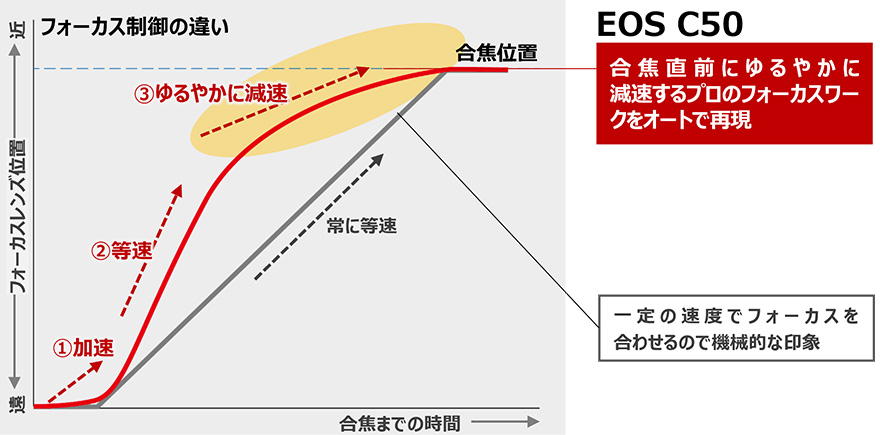 スチルで培った素早く正確に合うAFをベースにフォーカスマンのMFを再現して加速度を調整。まるで人がフォーカス送りをしているかのように滑らかに被写体へ移っていくフォーカス制御が搭載されています。