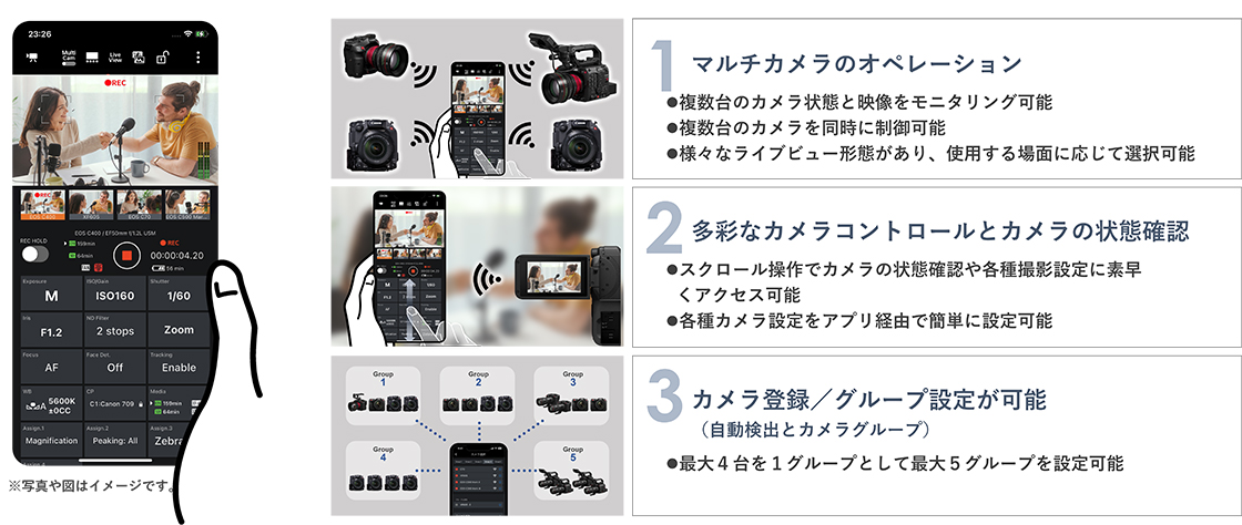 最大4台のCINEMA EOS/業務用カメラのカメラ状態と映像をiosデバイスからモニタリング可能。