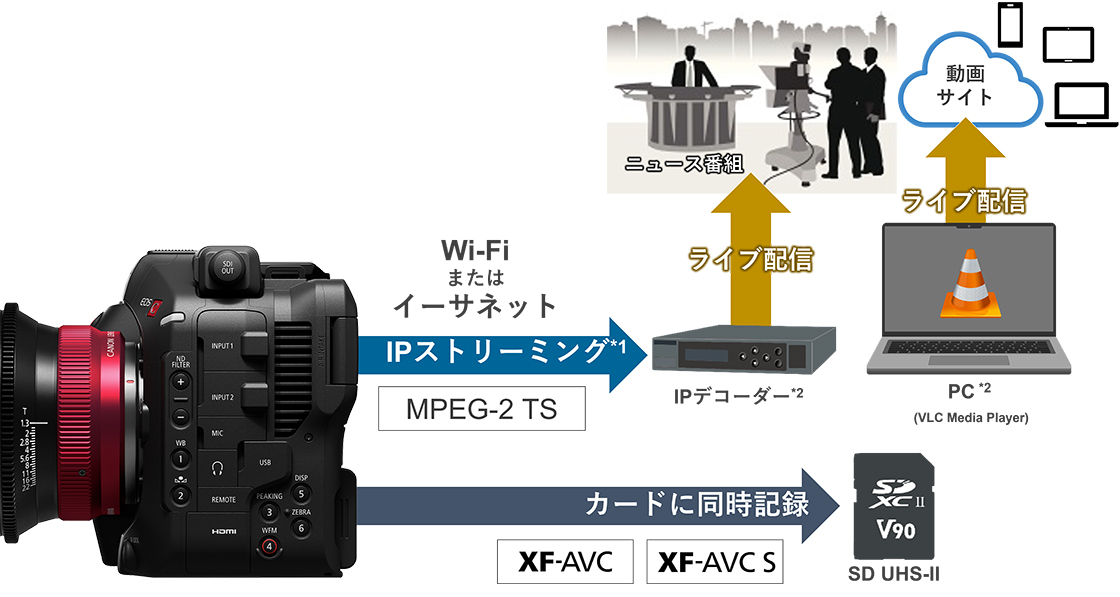 CINEMA EOSとして新たにSRTプロトコルに対応。IPデコーダーやPC※2に、本機の映像と音声のストリーミング送信が可能です。