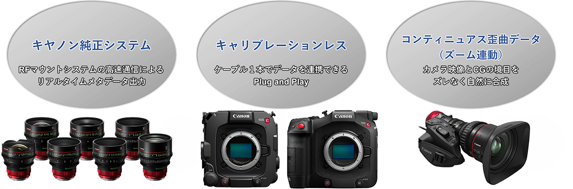 Canon Virtual Production Systemでは、レンズとカメラの撮影情報をリアルタイムに通信・演算することで、出力映像に応じたバーチャルプロダクションに適したCVメタデータをイーサネットケーブル1本で取り出し、または記録することが可能です。