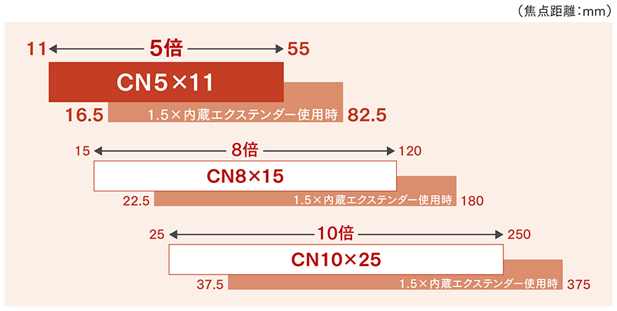 さらに同シリーズのCN8×15、CN10×25との組み合わせで11mm~375mm(1.5×内蔵エクステンダー併用時)をカバー可能。