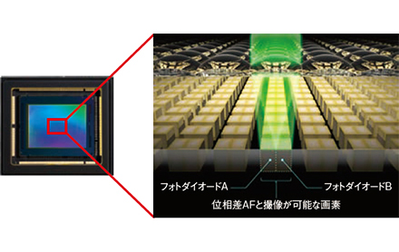 EOS MOVIEやCINEMA EOS SYSTEM で評価の高い像面位相差AF技術を採用。CMOSセンサー上の1画素を2つのフォトダイオードで構成。2つの画像信号を検出し、位相差AFを行うことにより、コントラストAFより高速なピント合わせを実現し、シビアなピント精度が求められる4K動画撮影をサポートします。AFエリアは画面内の縦横約80%をカバーし、AF枠をタッチ操作で直感的に指定することが可能です。