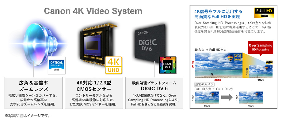 高性能映像処理プラットフォームDIGIC DV 6を搭載し、4K 30P記録に対応。さらに、4Kセンサーを活かした高画質なFull HD「Over Sampling HD Processing」にも対応しています。