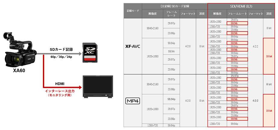 用途に合わせてXF-AVCまたはMP4フォーマットを選択できます。記録フォーマットに関わらず、モニタリング用にフルHD60i 外部出力が可能です。